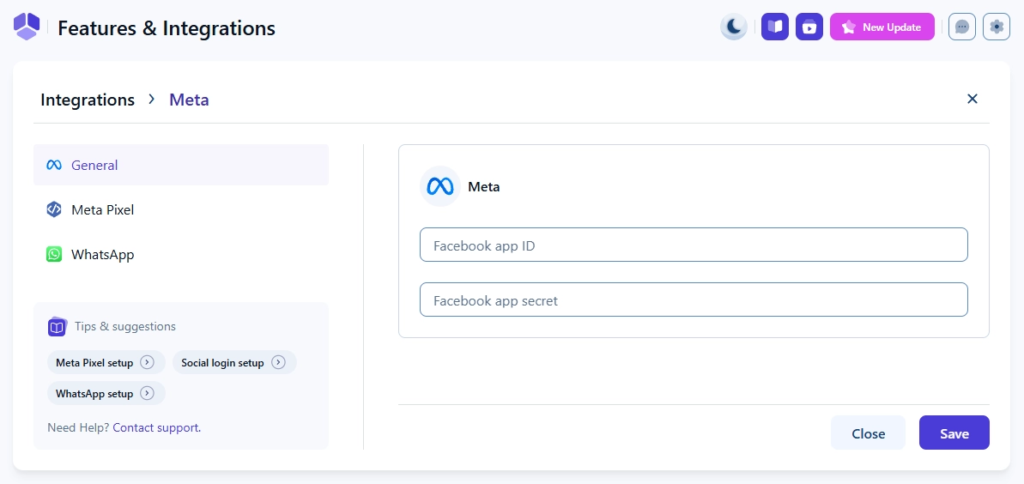 「機能と連携」→「連携」を開き、Facebookソーシャルログイン機能を有効にします。「設定」をクリックしてAmeliaのMeta設定ページを開き、Meta Developerアカウントから取得した「アプリID」と「App Secret」を入力します。