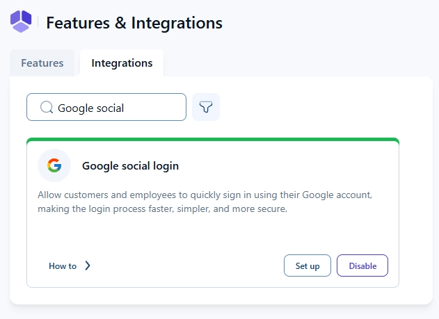Googleソーシャルログインを有効にするには、「機能と連携」→「連携」を開き、Googleソーシャルログイン機能を有効にします。有効にした後、「設定」ボタンをクリックして設定ページにアクセスしてください。スライダーをオンにするだけでは有効にならず、Googleカレンダー連携と同じ場所で設定を行います。
