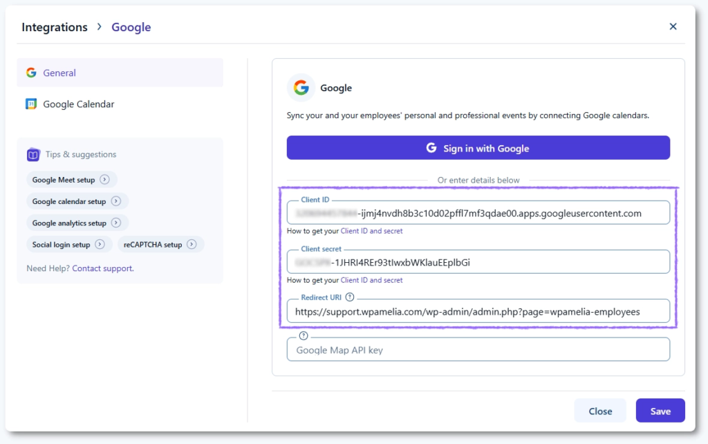Googleソーシャルログインには、独自のGoogle Cloud OAuthアプリケーションが必要です。設定画面はGoogleカレンダー連携と同一に見えますが、「Googleでサインイン」ボタンはAmeliaのデフォルトのGoogleアプリを介して接続されるため、ソーシャルログインには使用できません。