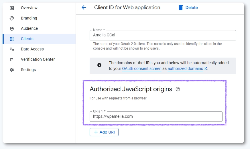 これにより、Googleがブラウザのリクエストを検証できるようになり、セキュリティポリシーによってログインがブロックされるのを防ぎます。認証フローを正常に完了させるために、AmeliaのリダイレクトURIも「承認済みのリダイレクトURI」の下に追加されていることを確認してください。