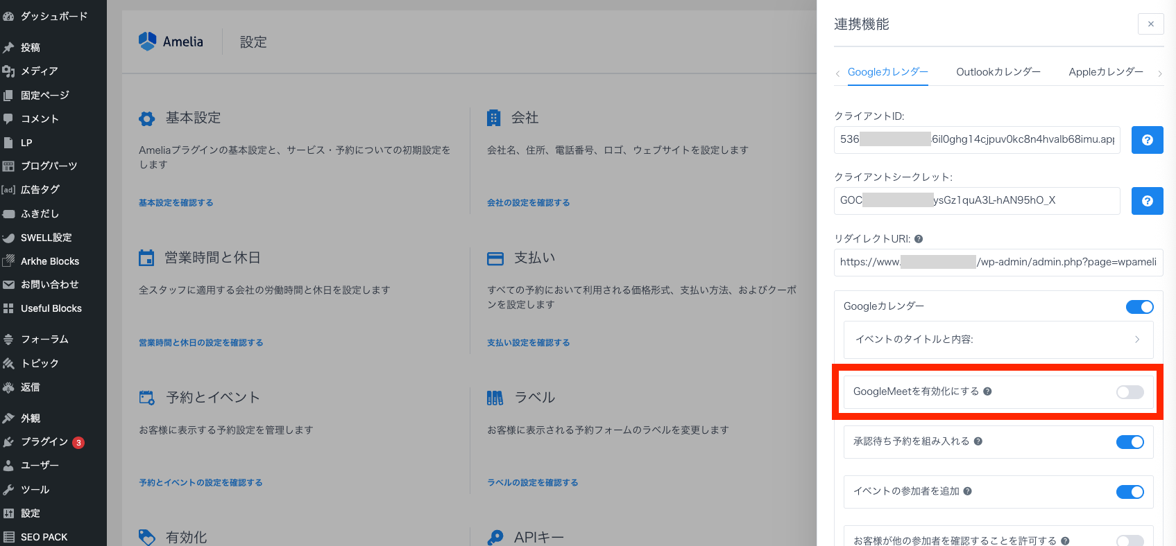 次に、Ameliaの設定ページに移動し、連携機能開いて、GoogleカレンダーセクションでGoogle Meetを有効にし、「保存」をクリックします。