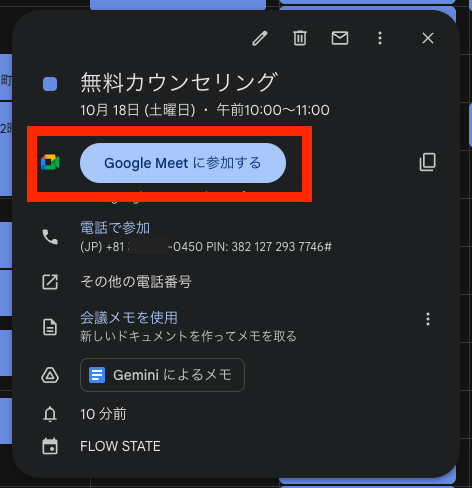Googleカレンダーのイベント内には青いGoogle Meetボタンが表示され、スタッフとお客様の両方が会議に参加できます。
