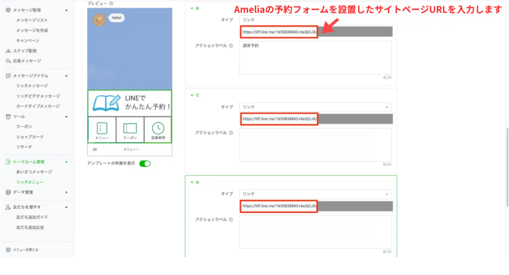 設定した「予約」画像のアクション設定で、タイプを「リンク」に設定し、Ameliaの予約フォームを設置したサイトページのURLを貼り付けます。そうすることで、LINE公式アカウントで「予約」画像の部分をタップすると、予約フォームがあるサイトページへ遷移するようになります。