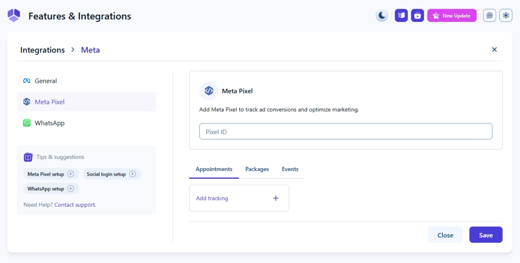 Meta Pixelを連携することで、お客様が予約フォームを操作したり、スタッフ、コース、またはイベントの予約を完了したりするたびに、Meta(Facebook)にイベントを送信できます。
