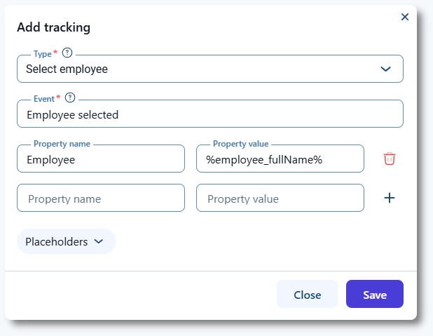 「ページ読み込み」以外のすべてのトラッキングタイプでは、プロパティ値の項目にプレースホルダーを使用して、サービス名、イベント名、スタッフ名などの動的な情報を送信できます。