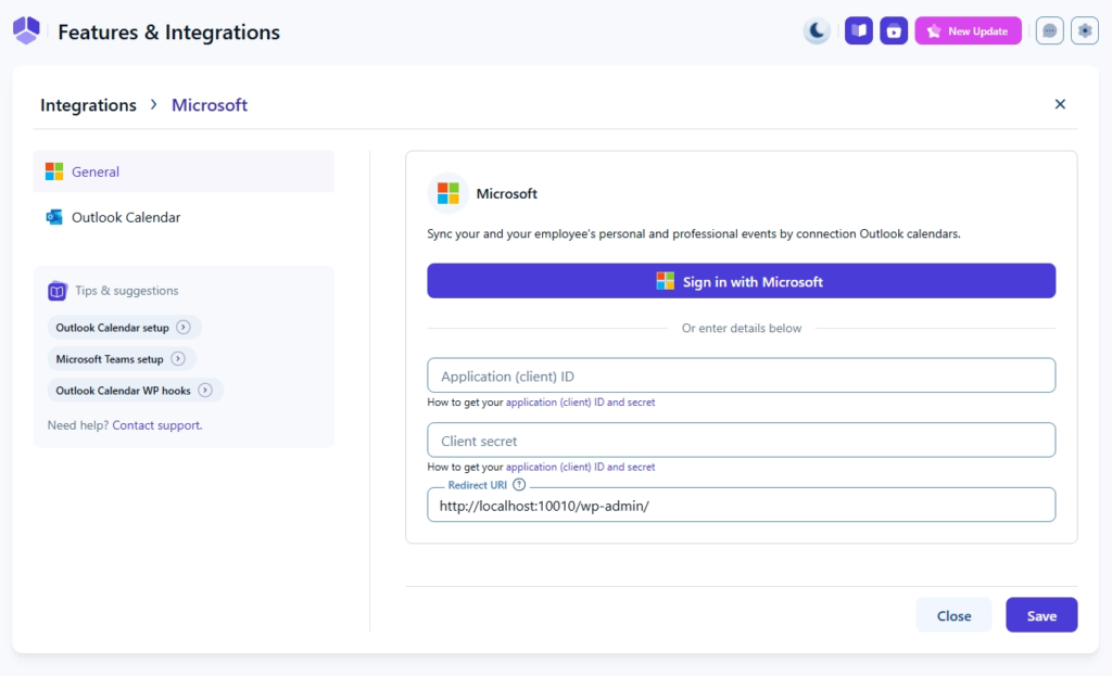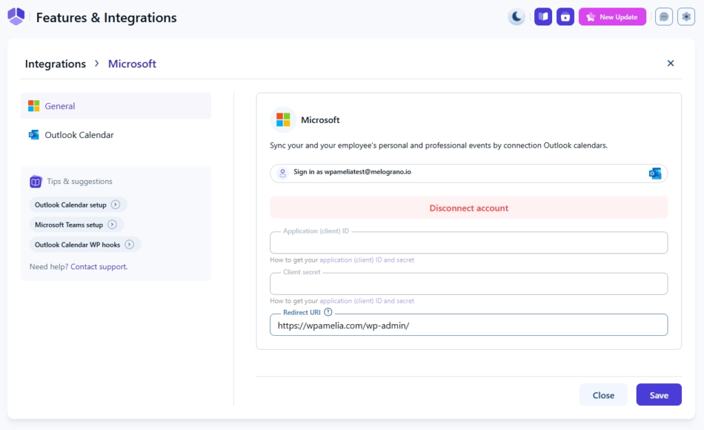 管理者は、ページの一番下までスクロールすると、 基本設定 → 連携 → 設定 → Outlook カレンダーから、カレンダーの動作を設定したり、スタッフを利用可能な Outlook カレンダーに接続したりできるようになりました。