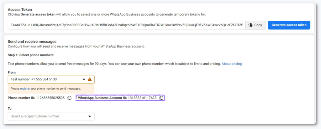 Metaは、テスト番号と一時トークンを使用したテスト環境を提供しています。テストリストに個人の番号を追加し、テストメッセージを送信して、すべてが正常に機能することを確認できます。