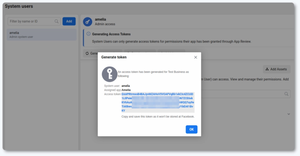 Metaのビジネス設定を開き、ユーザー → システムユーザーに移動し、管理者の役割を持つ新しいシステムユーザーを作成します。