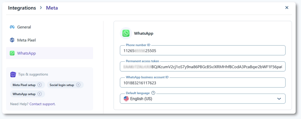 後でWhatsAppテンプレートで設定する言語と一致するように「デフォルトの言語」を選択し、設定を保存します。