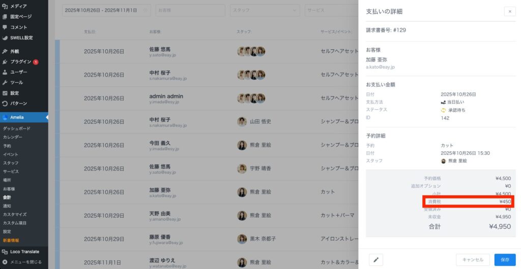 ただし、後者の税込価格に含まれる税額については、Ameliaの「支払い」セクションで該当の取引を選んで詳細を確認すれば表示されます。