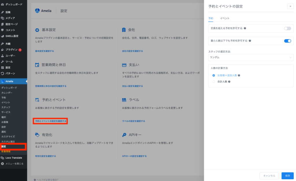 Ameliaプラグインの予約設定は、予約に関してより詳細なカスタマイズオプションを設定する必要があるユーザー向けに提供されています。予約設定は「設定」ページを開き、「予約とイベント」をクリックして、「予約」タブを開いて行うことできます。