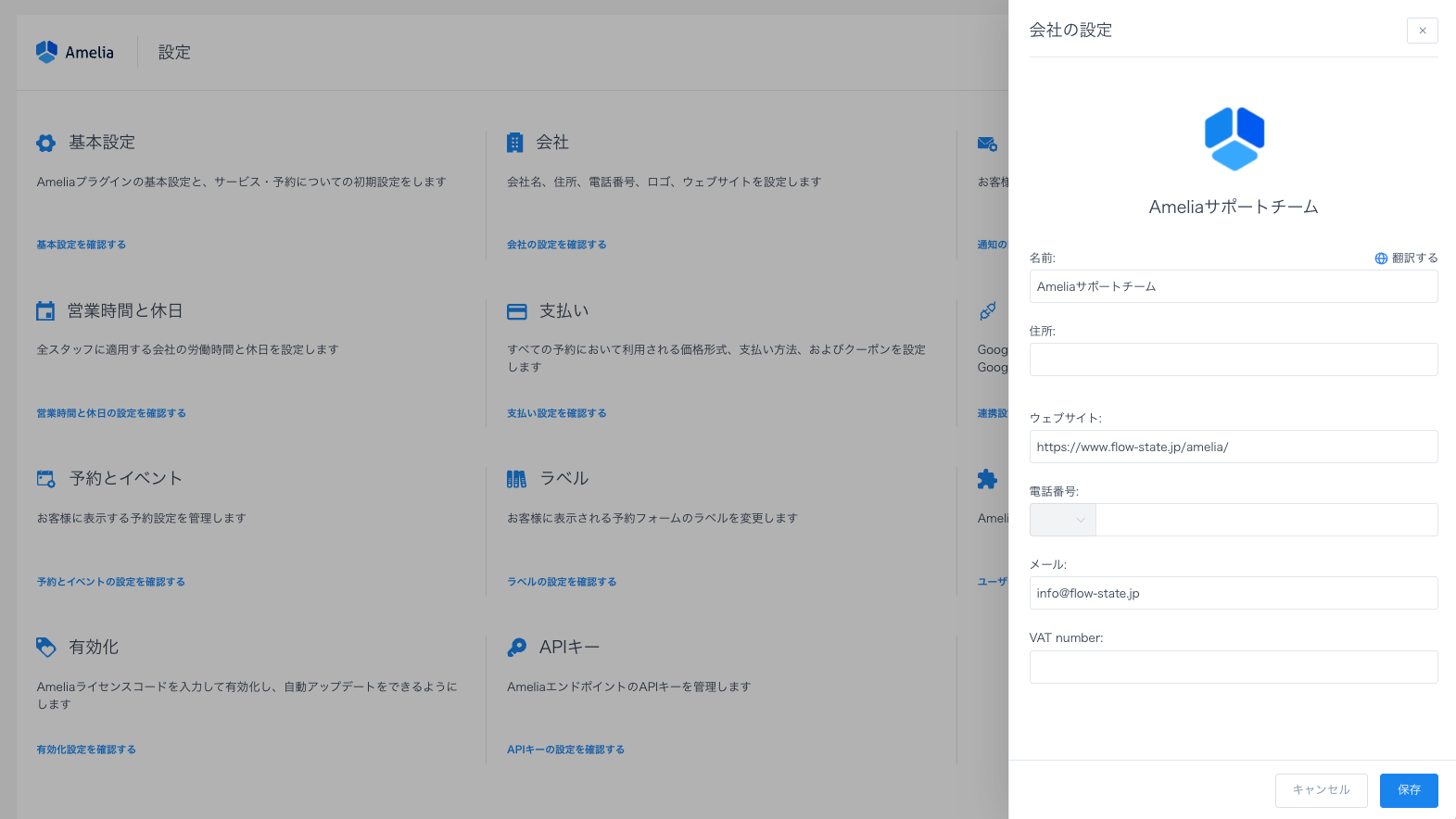操作ガイド 「会社」を設定する この設定では、会社の画像、名称、住所、ウェブサイト、電話番号を登録できます。登録された情報は、通知のプレースホルダーとして使用されます。 「Amelia」>「設定」>「会社」 の入力項目を使って、組織の画像、名称、住所、電話番号を調整してください。これらの項目に入力された値は、後ほどスタッフとお客様に自動送信される通知で使用されます。 この設定は管理者のみご利用いただけます。