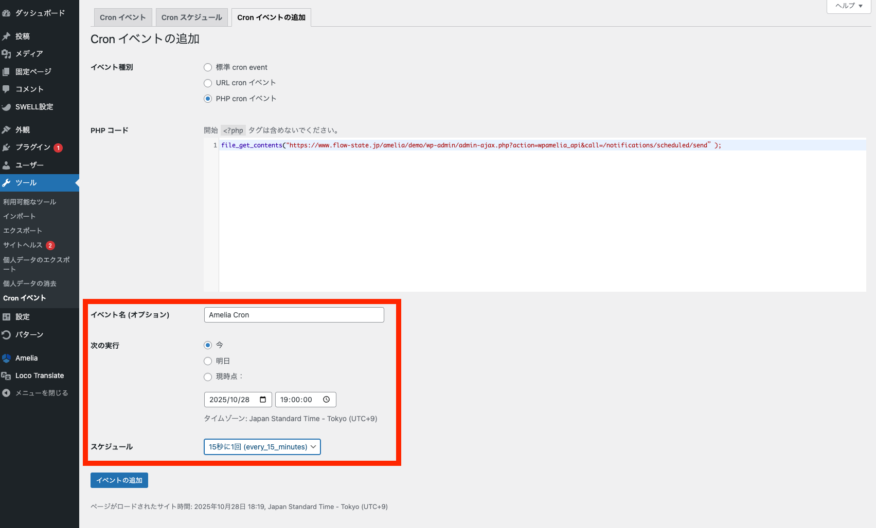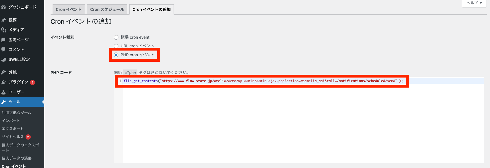 「PHP Cron イベントの追加」を選択し、PHPコードに下のコードを入力した後に、先ほどコピーしたスケジュール通知の下にあるURLを追加します。