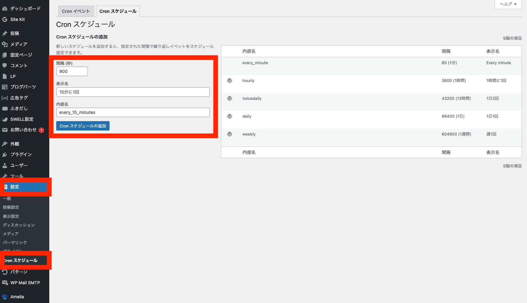 次に、WordPressメニューの「設定」>「Cronスケジュール」に移動し、一番下までスクロールして15分間隔を追加します。