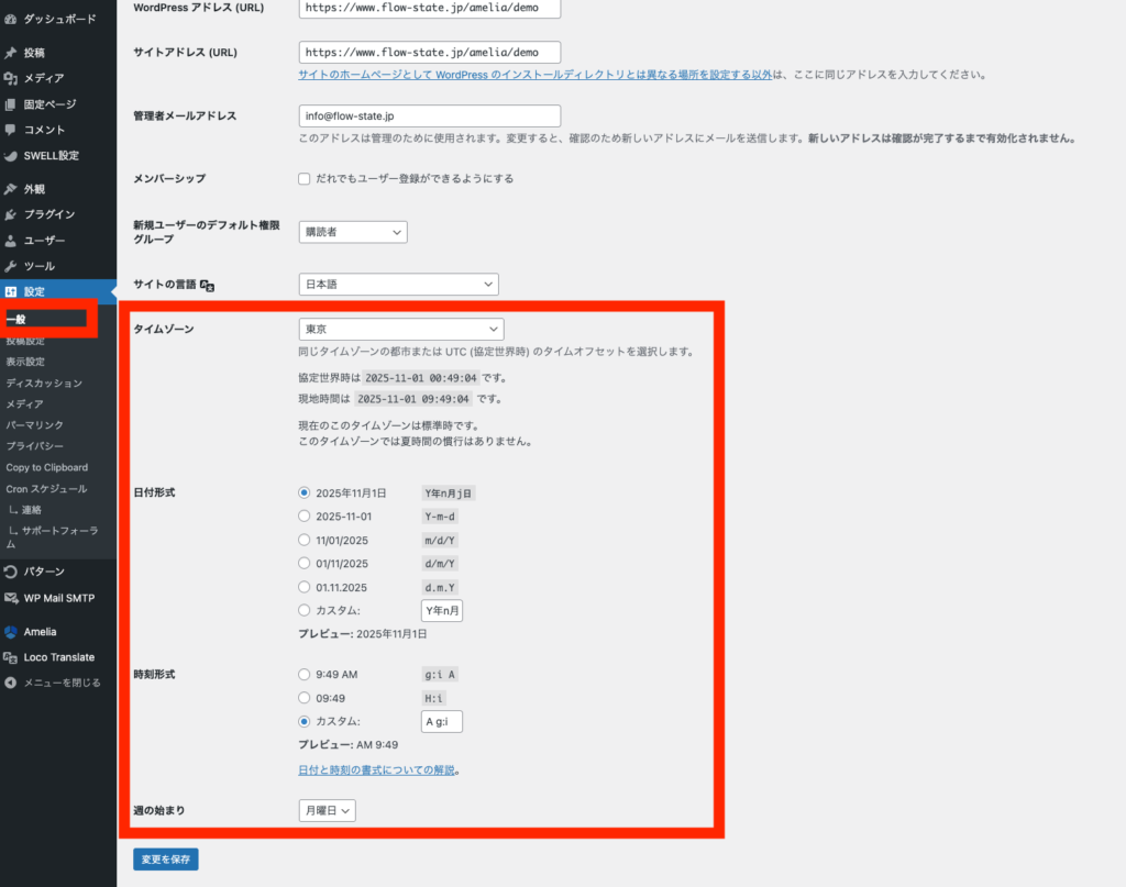 WordPress管理画面の「設定」>「一般」ページに移動し 、「タイムゾーン」セクションまでスクロールダウンすることでいつでも変更できます。「タイムゾーン」、「日付形式」、「時刻形式」、「週の開始日」 を、ビジネスに合わせて設定してください。「変更を保存」をクリックすると、設定がAmeliaにも適用されます。