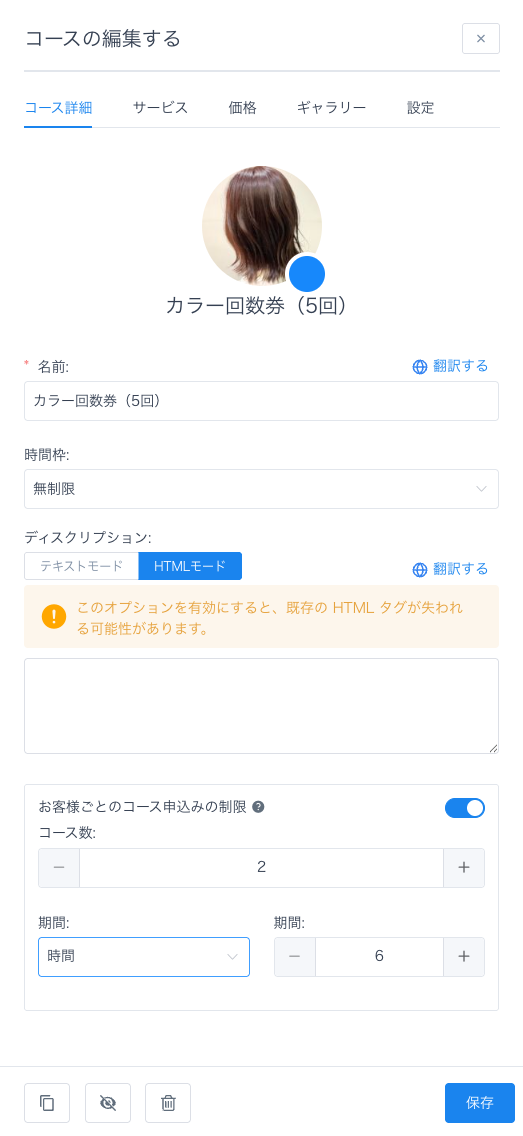 注意:コースに期間を設定した場合、その期間はコース購入時点から計算されます。期間が過ぎると、お客様は残りの予約をすることができなくなり、コースはサイトページのお客様マイページから削除されます。