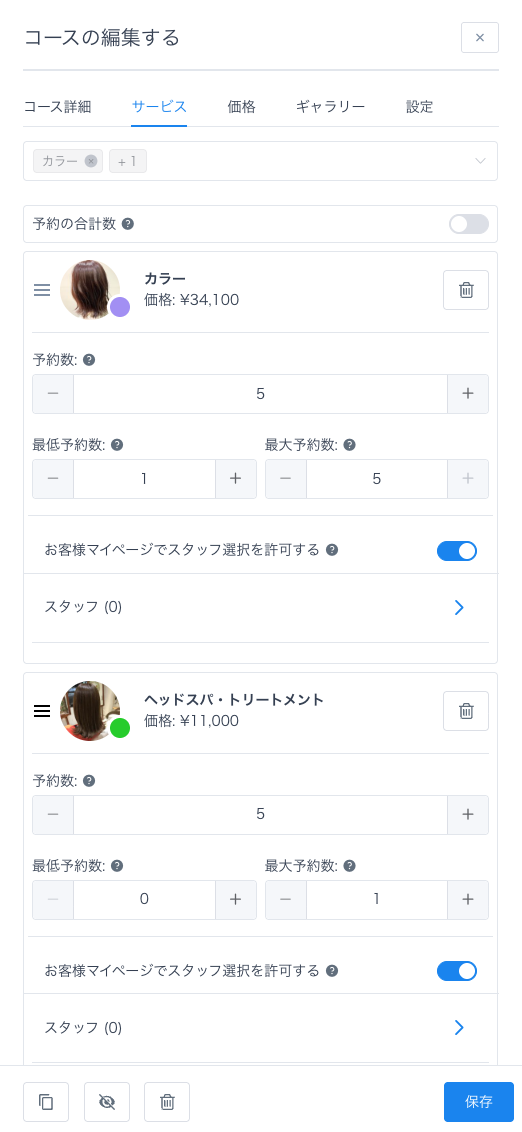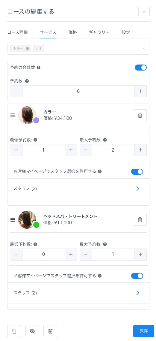 コース内の各サービスについて、お客様が最初の予約手続きで予約する必要がある「最低予約数」と「最大予約数」を設定できます。両方のオプションを「0」に設定した場合や、「最低予約数」をコースに含まれる予約数の合計より低く設定した場合、お客様はサイトページのお客様マイページで残りの予約を完了できます。