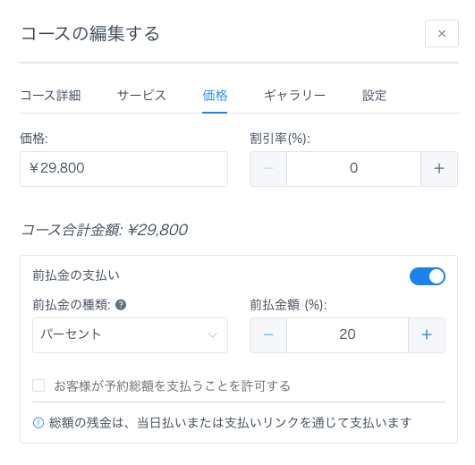 価格の下に「前払金の支払いを有効にする」オプションが表示されます。オンライン決済を有効にしている場合は、コースの前払金の支払いを設定できます。