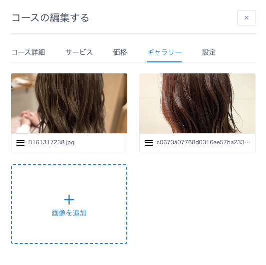 カタログ予約フォームをご利用の際に表示されるコースの写真をアップロードできます。「+」をクリックして写真をアップロードすると、すぐに表示されます。複数の写真をアップロードした場合、ハンバーガーアイコンを使ってドラッグ&ドロップで並べ替えることができます。この順序は、カタログ予約フォームの順序にも反映されます。