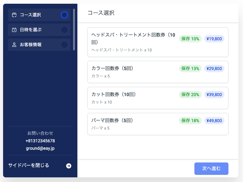 ステップバイステップの予約フォームを選択した場合、お客様がサービスを選択すると、そのコースにそのサービスが含まれているという提案のようにコース表示されます。