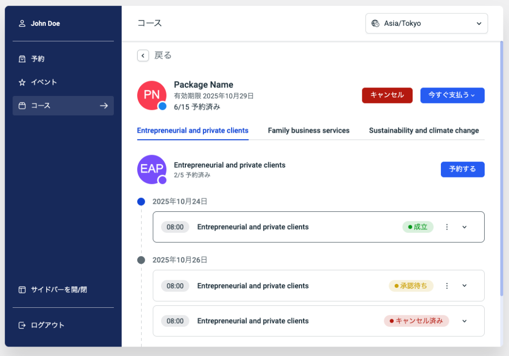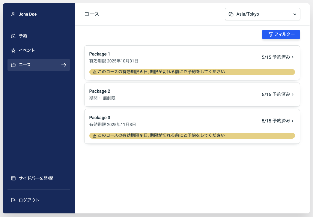 お客様が予約ページのサイトページにアクセスすると、上部に購入済みのコース、下部に予約済みの予約リストが表示されます。各コースには、有効期限と予約可能な残りの回数に関する情報が表示されます。