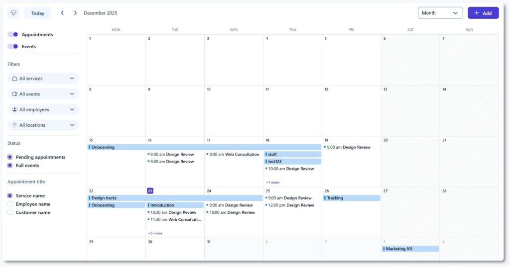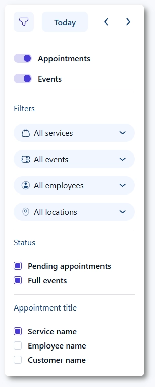 カレンダーは予約をカレンダーグリッドに表示するため、何がいつスケジュールされているかを即座に確認できます。予約とイベントを一緒に表示することも、フィルターボタンをクリックした後に左側のトグルを使用して一方を非表示にすることもできます。