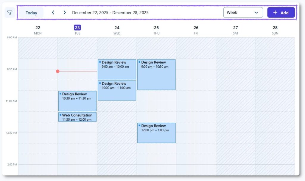 カレンダーは複数の表示形式、高度なフィルタリング、直接予約の作成をサポートしており、日常のスケジュール管理の中心的な場所となります。
