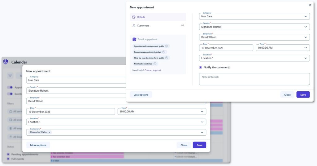 詳細設定をクリックすると、予約またはイベントのメニューで使用するものと同じ作成フローがカレンダーのポップアップ内に表示されます。これにより、カレンダーページを離れることなく、より高度な設定を完了できます。