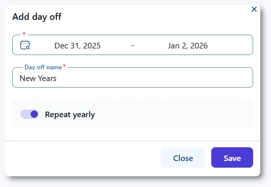 休日セクションでは、すべてのスタッフに適用される会社全体の非稼働日を設定できます。これらの休日はシステム内のすべてのサービス提供者に適用され、スタッフが個別に上書きや編集を行うことはできません。