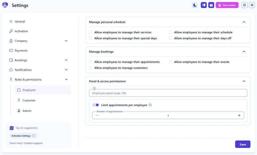 - スタッフにお客様の管理を許可する:これを有効にすると、スタッフはお客様の名前、連絡先情報、メモなどのお客様の詳細を表示および編集できるようになります。お客様データを制限したい場合は、このオプションを無効のままにしてください。