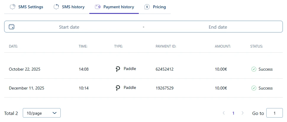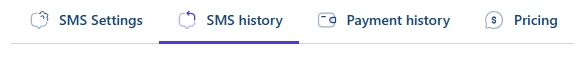 支払履歴タブには、SMS残高のリチャージのために行われたすべての支払が一覧表示されます。各支払エントリには以下が表示されます。