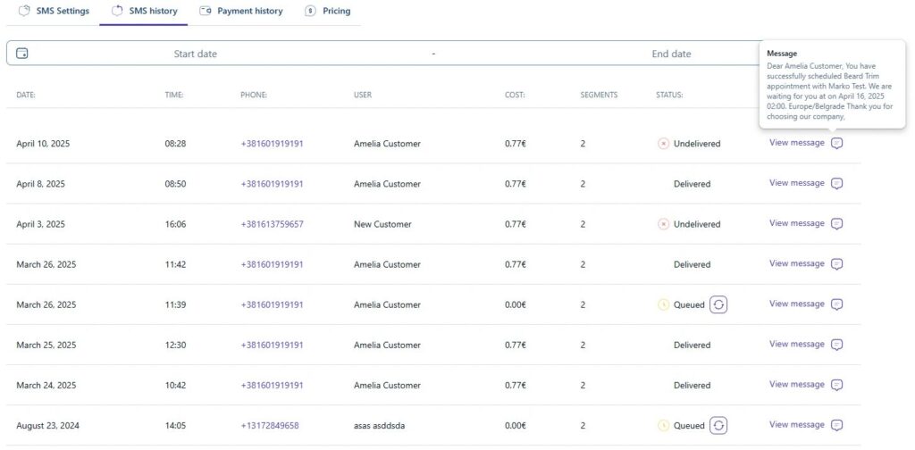 Ameliaは、すべてのSMS通信の追跡、SMSクレジットの支払状況の監視、および国別のSMSセグメント価格を確認するための一連のツールを提供しています。これらのログは、配信状況の把握、メッセージの問題のトラブルシューティング、および今後のSMS通知コストの予測に役立ちます。