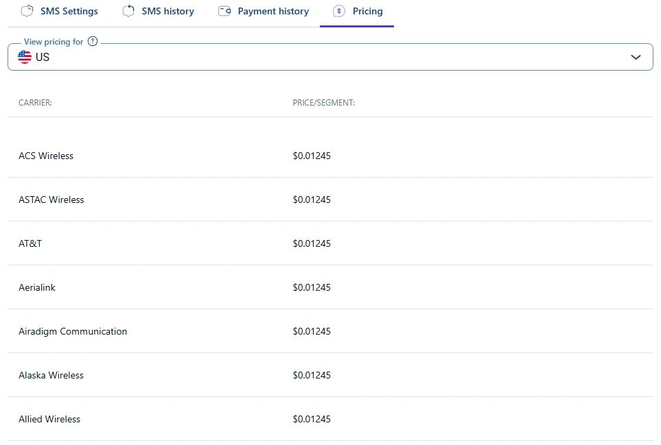 料金タブには、サポートされている各国の1つのSMSセグメントあたりのコストが表示されます。デフォルトの表示では米国の料金が読み込まれますが、ドロップダウンメニューから他の国を選択できます。