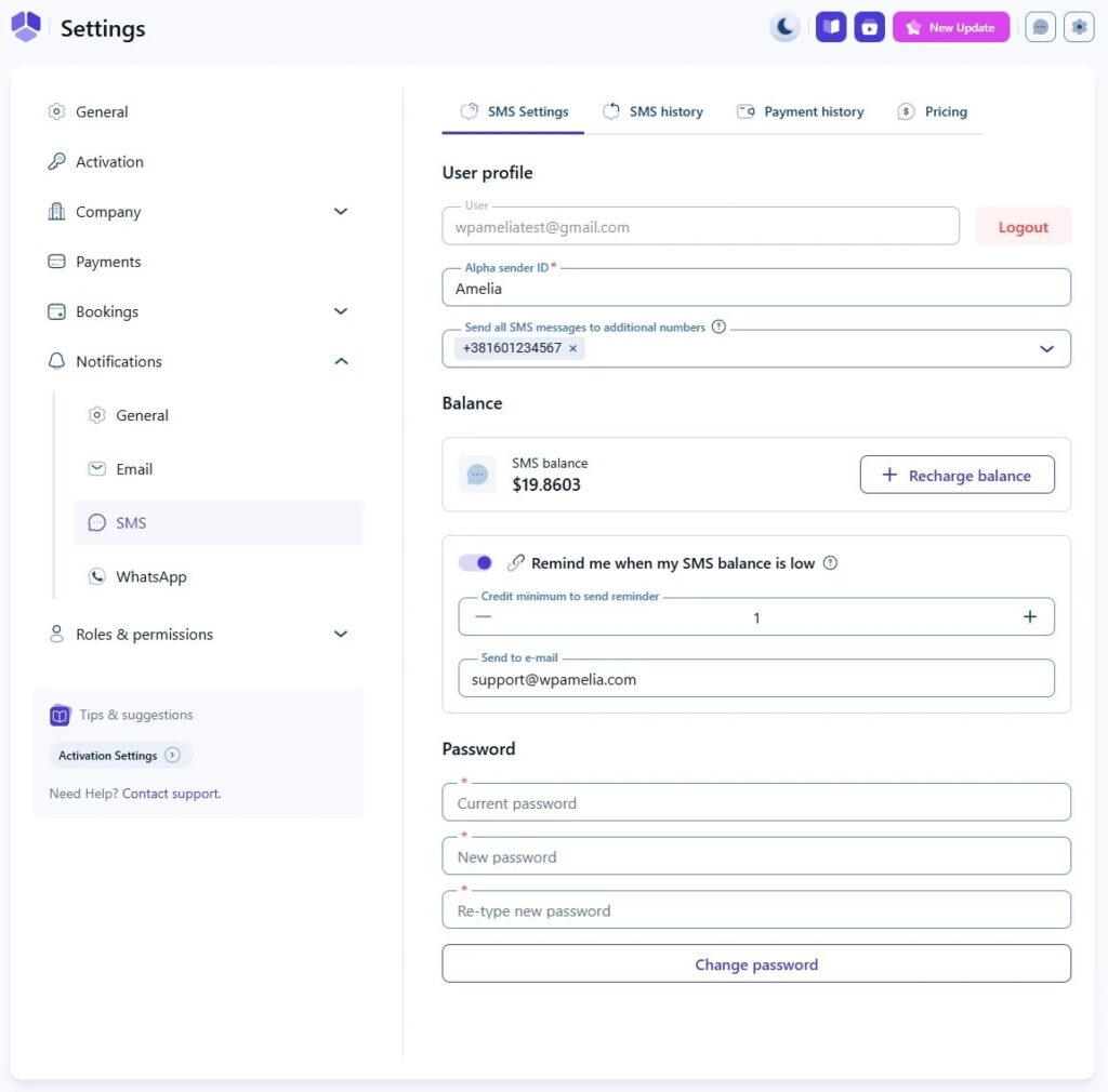 AmeliaのSMS設定ページでは、Amelia SMSアカウントの詳細を管理できます。ここでは、SMSアカウントに紐付けられたメールアドレスの確認、アルファ送信者IDの設定、追加番号へのメッセージ送信、SMS残高の監視とチャージ、残高不足通知の設定、およびSMSパスワードの変更が行えます。