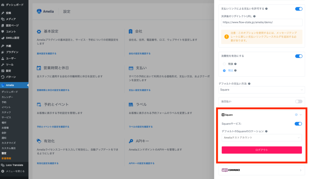 OAuthプロセスを完了するには、Squareアカウントにログインする必要があります。アカウントが接続されると、Ameliaの同じページにリダイレクトされます。ここで支払い場所を選択し、必要に応じて「ログアウト」することもできます。設定を確定するには、編集画面で「保存」をクリックすることを忘れないでください。