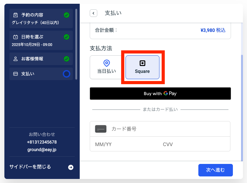 お客様は、メールの支払いリンクを使用するだけでなく、予約をして支払いオプションとして「当日払い」を選択した場合は、お客様マイページから直接 Square の支払い方法を使用して支払うことができます。