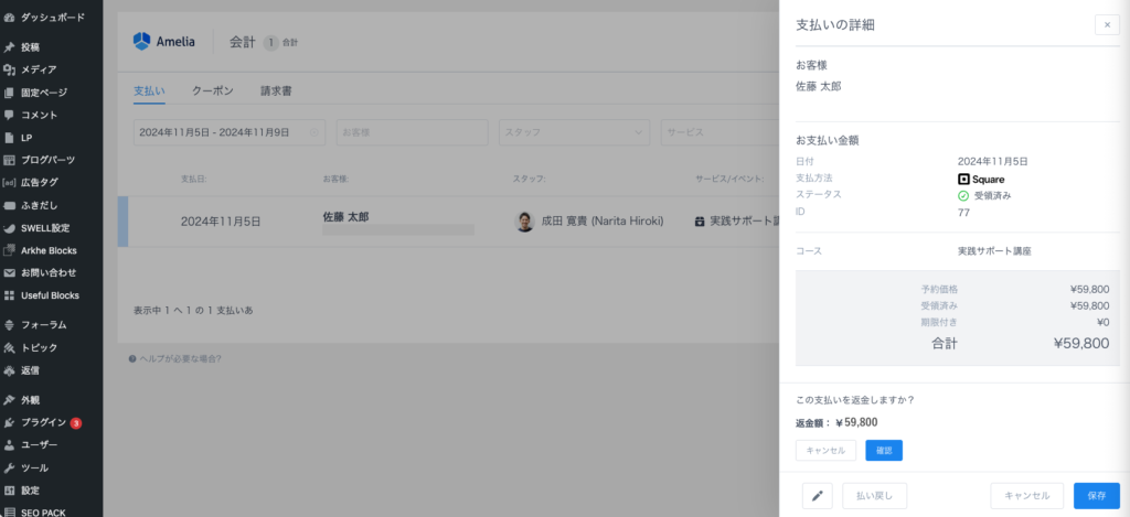 お支払いはSquareで払い戻され、Ameliaでは「返金済み」ステータスが表示されます。さらに、Squareの払い戻しWebhookが実装されているため、Squareで直接払い戻されたお支払いは、Ameliaでも自動的に「返金済み」ステータスに更新されます。