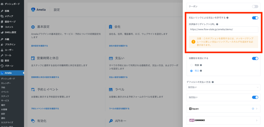 Ameliaで支払いリンクをテストするには、設定ページに移動し、支払い設定を開きます。「支払いリンクによる支払いを許可する」オプションを有効にし、「Square」と並んで「支払いリンクによる支払いを許可する」が有効になっていることを確認してください。