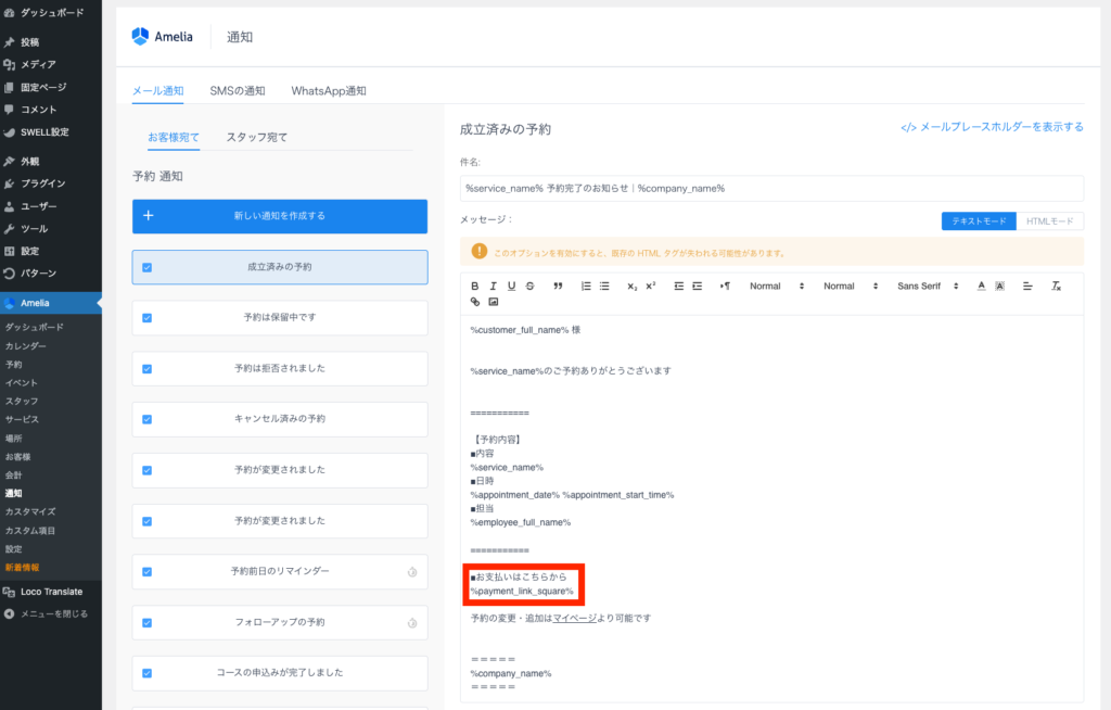 次に、「通知」ページに移動し、「成立済みの予約」通知に%payment_link_square%プレースホルダーを追加します。