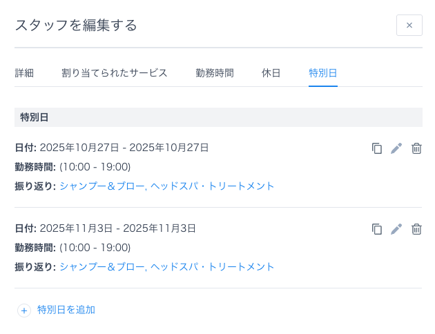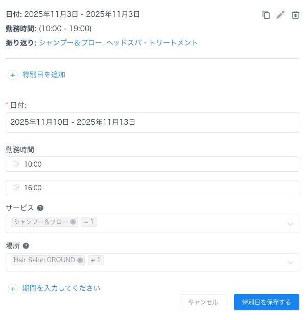 「編集」ボタンをクリックすると、特別日が複製されますが、日付範囲は空白のままになります。これにより、期間、選択したサービス、場所などの詳細を再入力することなく、同じ設定を異なる日付に簡単に適用できます。