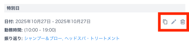 作成された各特別日の横には、次の3つのボタンがあります。