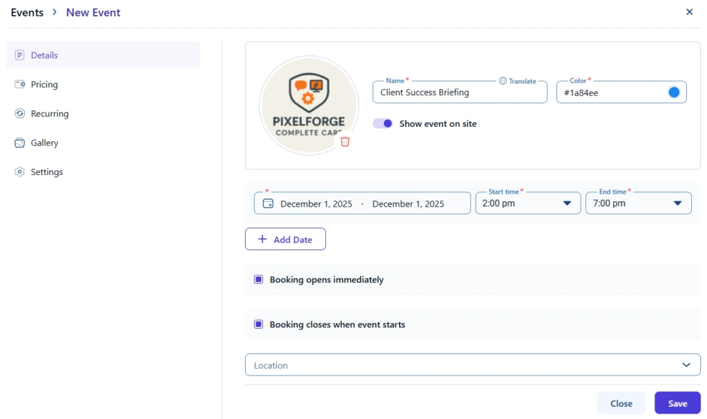 はい、すべて任意で設定可能です。場所、主催者、タグ、短い説明、画像などを追加できます。イベントの定員と料金は、左側の「料金設定」タブで設定します。このタブには追加の設定オプションも含まれており、詳細はイベントに関する操作ガイドで説明されています。