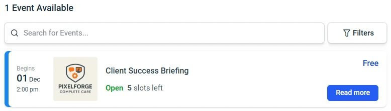 イベントをクリックし、「イベントを予約」ボタンをクリックして、参加者の詳細を入力し、予約を確定します。これで最初のテスト登録が完了しました。