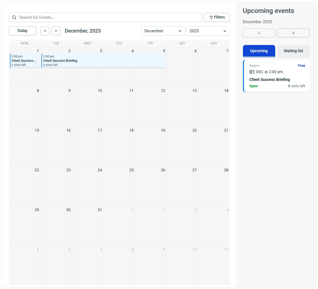ページを公開すると、お客様画面にイベントリストまたはカレンダーが表示されます。
