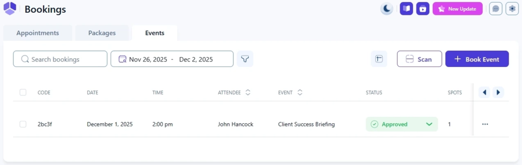 先ほど追加したお客様が表示されます。これでイベントが機能し、人々が即座に枠を確保できるようになりました。次に、日付を追加したり、料金やグループサイズの制限を変更したりしてみましょう。また、必要に応じて説明文を微調整してください。