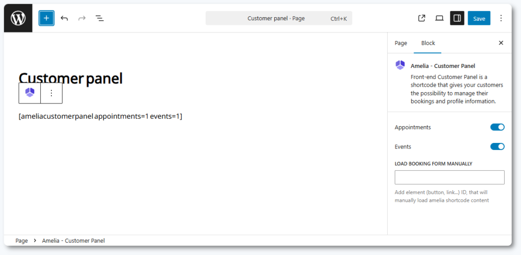 お客様マイページを作成するには、WordPressの任意のページに「Amelia – お客様マイページ」ブロックを追加してください。Gutenberg、Elementor、またはDiviを使用できます。ブロックを挿入した後、「予約」と「繰り返しイベント」のスライダーを使用して、パネルに表示する予約タイプを選択します。パネルには表示するコンテンツが必要なため、少なくとも1つのスライダーを有効にしておく必要があります。
