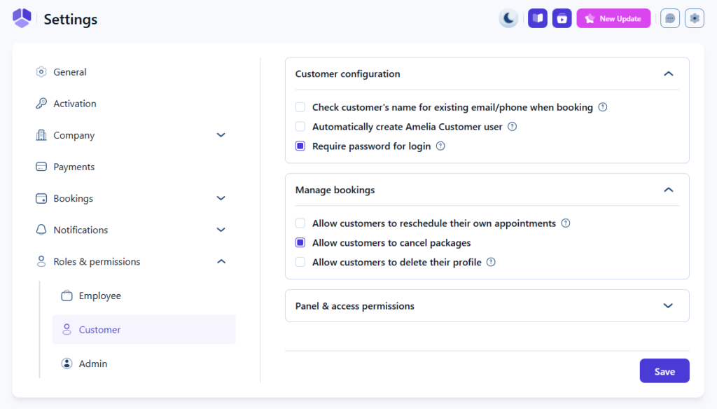 お客様マイページを有効にするには、「基本設定」→「ロールと権限」→「お客様」に移動し、「パネルとアクセス権限」セクションを展開して、パネルが公開されているページのURLを「お客様マイページURL」フィールドに貼り付けます。AmeliaはこのURLを使用して通知内にパネルへのリンクを含め、パスワードを使用しないお客様のために一意のアクセストークンを生成します。