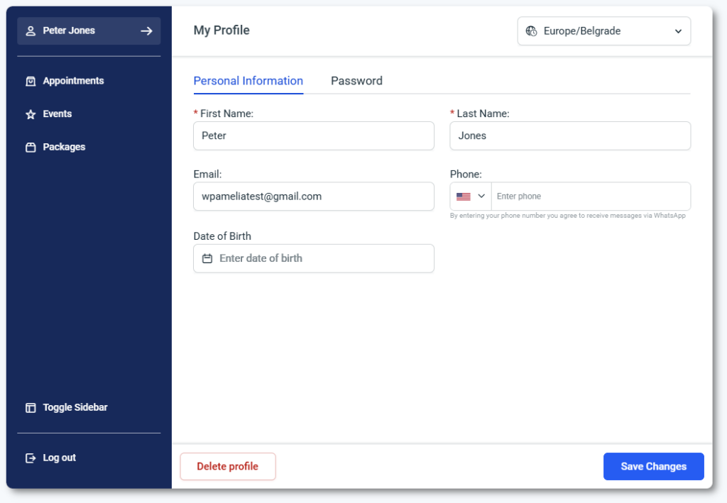 お客様は、パネルの左上隅にある氏名をクリックすることで、名前、メール、電話番号、生年月日を更新できます。プロフィール削除が有効になっている場合は、ここに削除ボタンも表示されます。