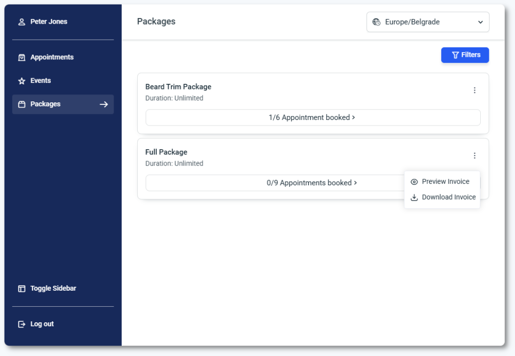 Ameliaで請求書機能が有効になっており、予約に対して請求書が存在する場合、お客様はお客様マイページの3点リーダーメニューから請求書にアクセスできます。これは予約、繰り返しイベント、およびコースに適用されます。