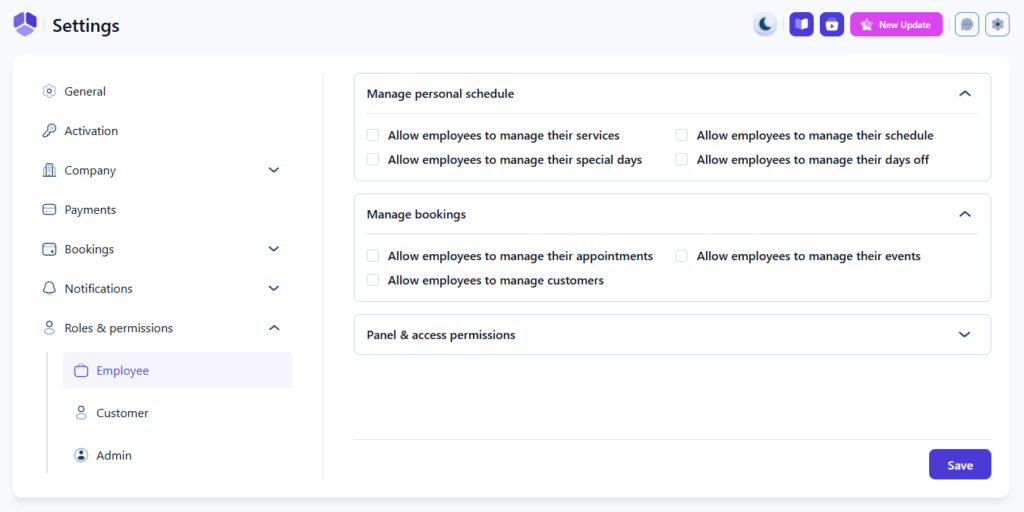 スタッフが何を変更できるかは管理者が決定し、Ameliaで設定した権限に基づいてマイページの内容が自動的に調整されます。